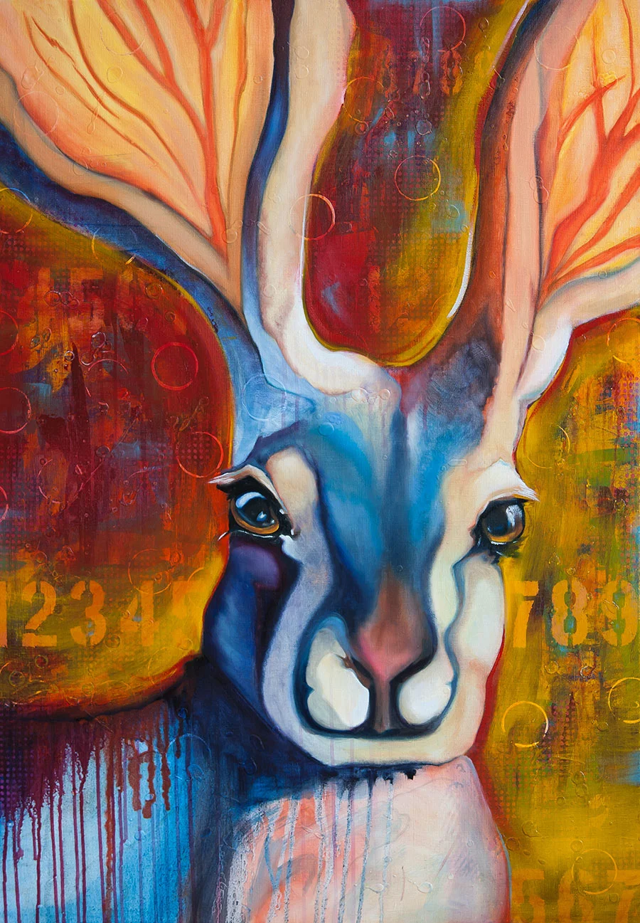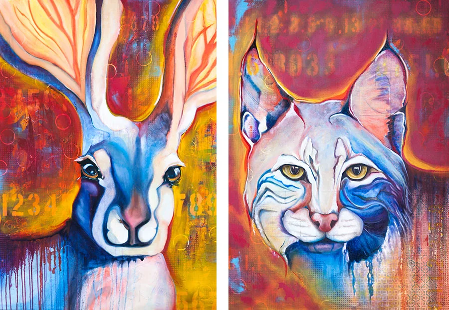 Infinite Jack and The Golden Mean were commissioned by the same collector and are meant to be hung together. The concept of predator and prey is put into a new perspective by making the animals of equal stature, and putting them on eye level with each other. Infinite Jack's background of numbers represents that ongoing, and infinite mathematical representation of the world.